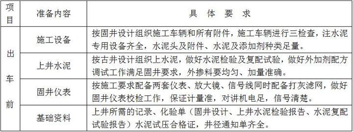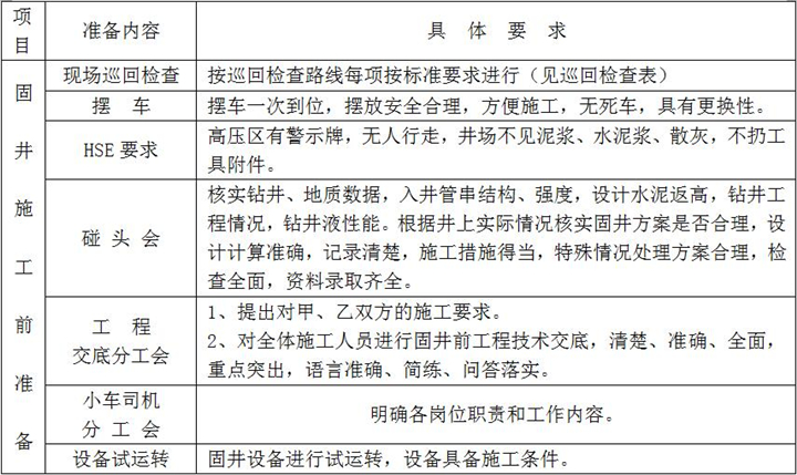 固井施工準備是落實固井施工方案和固井設計重要的一個環(huán)節(jié),是固好一口井的前期準備工作,具體內容及要求如下: