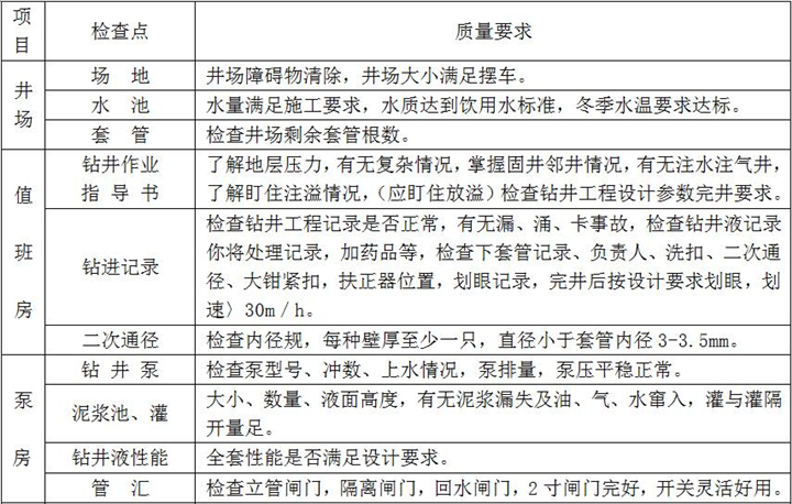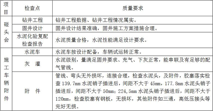 2、固井施工:按設計注入隔離液,水泥漿壓膠塞,頂替鉆井液、碰壓、試壓完成、固井施工過程檢查點項及要求如下: